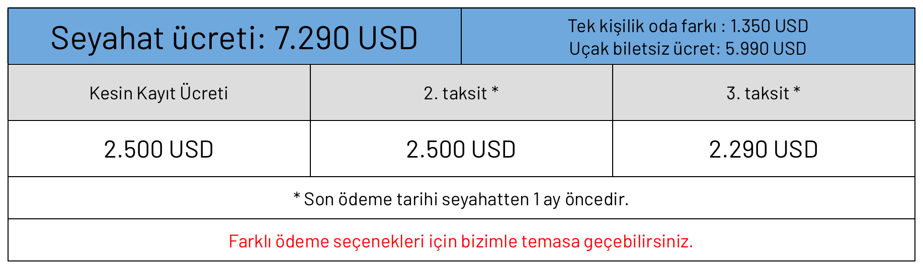 Bu seyahatte konaklayacağımız otellerin listesini aşağıda bulabilirsiniz.
