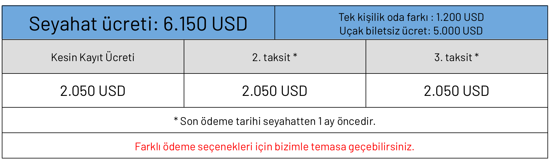 Bu seyahatte konaklayacağımız otellerin listesini aşağıda bulabilirsiniz.